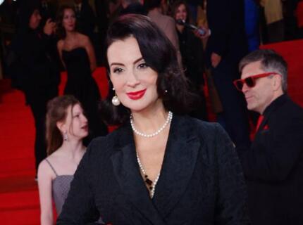 «В такой славной компании»: Стриженова в алой юбке-футляре и туфлях на каблуке предстала на публике