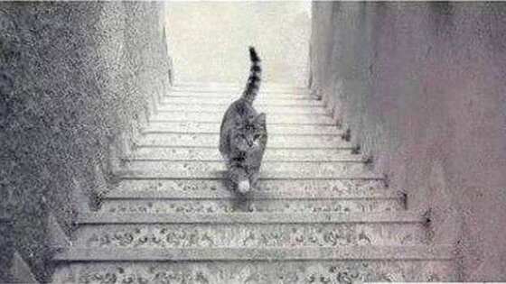 На эту иллюзию с кошкой на лестнице можно взглянуть с разных сторон. Одни люди видят, что она движется наверх, а другие утверждают, что она бежит вниз. От того, как вы воспринимаете эту картинку зависит ваш тип личности.