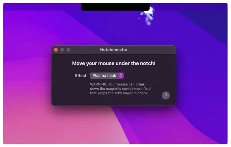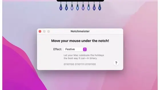 The Iconfactory выпустила приложение под названием Notchmeister, которое позволяет добавить различные эффекты к вырезу. Точнее говоря, бесплатное приложение предлагает несколько эффектов, которые можно применить к области экрана вокруг выемки, в том числе праздничные огоньки, свисающие с «чёлки», всплывающий экран радара и эффект свечения, отслеживающий ваш указатель мыши.