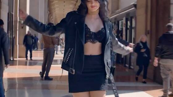 В ролике 18-летняя девушка прогуливается по улицам Милана, Италия, в черной облегающей юбке длины мини и бюстгальтере, оформленном кружевами. Ее образ дополняют кожаная куртка-косуха, ботинки, массивные наушники и золотое колье.