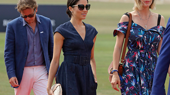 Для выхода с принцем Гарри Маркл также выбрала джинсовое миди-платье Carolina Herrera и нюдовые туфли-лодочки Aquazzura.