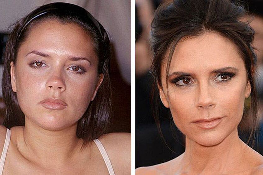 Виктория полюбила пластику лица еще в юности: первая операция по изменению формы носа прошла еще в 1998 году. Тогда нос стал уже и изящнее. Однако, с тех пор Бекхэм переделывала его еще минимум три раза, получив в итоге желаемую форму. Помимо ринопластики, хирурги удалили комки Биша, чтобы убрать детскую припухлость и ямочки на щеках. В 2014 году Виктория решила сделать овал лица еще уже, а скулы еще точенее и перестаралась: на публике она появилась со смещенными щеками, которые выглядели устрашающе. Следующие три года Бекхэм провела, исправляя огрехи: скулы вернули на место, сделали пластику подбородка, увеличили губы, исправили зубы. Наконец звезда получила идеальное лицо.