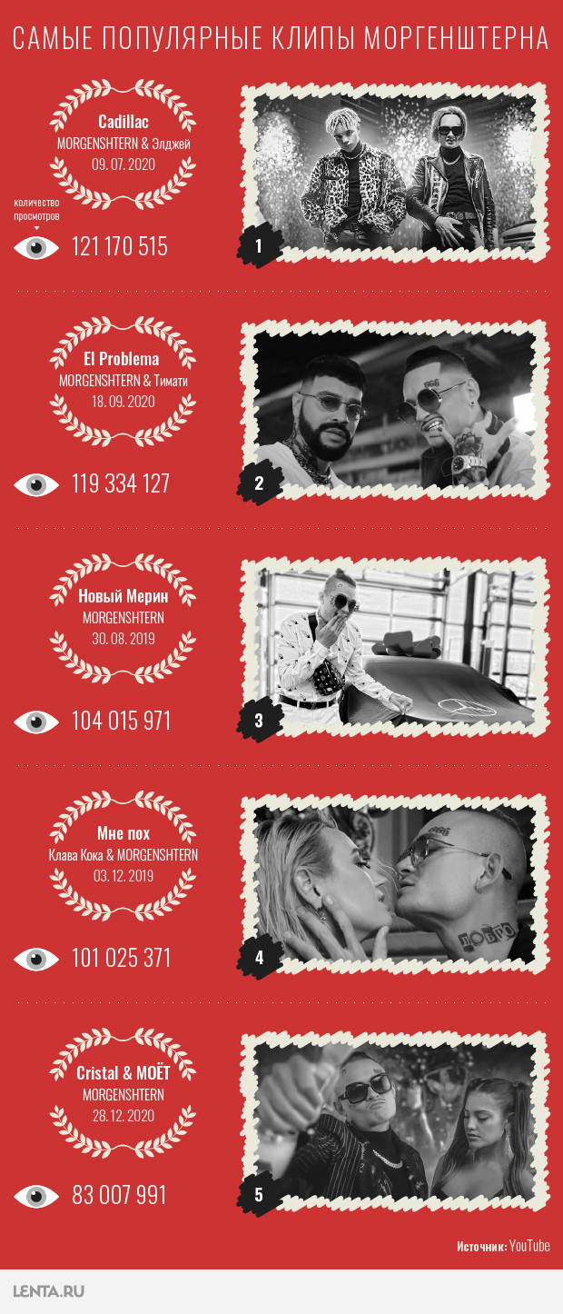 Последние несколько недель 23-летний рэпер Моргенштерн не исчезает из заголовков СМИ: артист выпустил четыре клипа, набравшие в сумме более 60 миллионов просмотров, был осужден за пропаганду наркотиков в песнях, получил предложение руки и сердца от своей девушки, устроил скандал на музыкальной премии, попал в больницу и успел выпустить сразу два альбома с разницей в неделю. «Лента.ру» рассказывает, почему вся Россия говорит о 23-летнем рэпере из Уфы, чем он прославился и в чем секрет его популярности.
