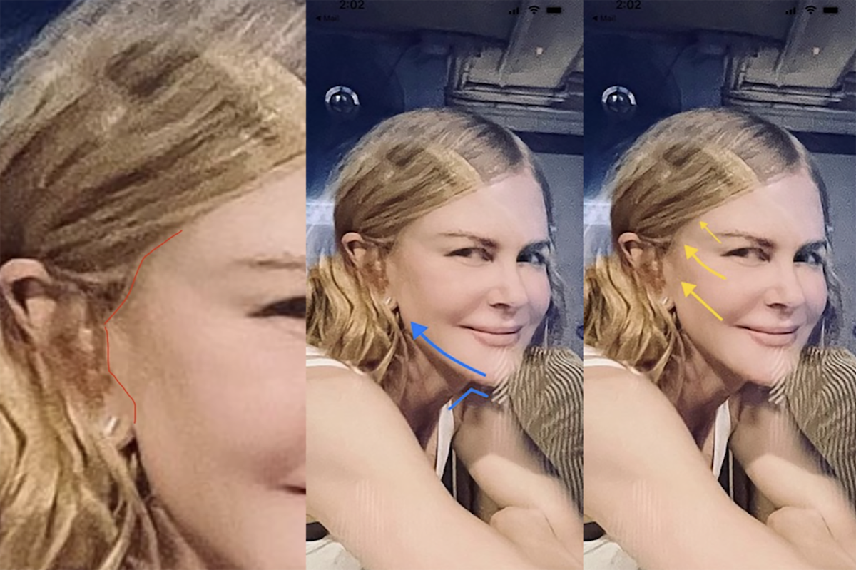 По направлению линий лица можно определить, что более глубокие структуры были подтянуты и приподняты (жёлтые стрелки), наиболее это заметно в области надбровных дуг и уголков рта. Линия челюсти и шея выглядят подтянутыми и гораздо более молодыми, чем это возможно без хирургического вмешательства или серьёзного фейс-тюнинга (синие линии). На фотографии с красными линиями показано расположение шрамов от подтяжки лица и шеи, и вы можете видеть, что область прямо перед этой линией разреза выглядит плоской. Это классика раннего заживления после фейслифтинга, с момента которого пошёл год или даже меньше. Однако у дважды сертифицированного и отмеченного наградами пластического хирура Дэвида Шафера немного иное мнение насчёт актрисы.