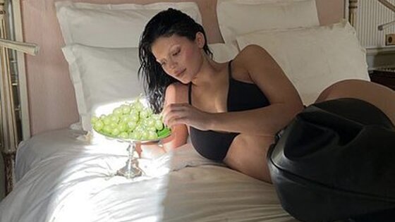 Так, знаменитость разместила два фото, на которых она позирует с серебряной подставкой для винограда на кровати. При этом на ней надет комплект, состоящий из бюстгальтера и трусов черного цвета, а также высокие кожаные сапоги. На опубликованных кадрах видно, что звезда популярного телешоу решила сменить имидж, обесцветив брови.