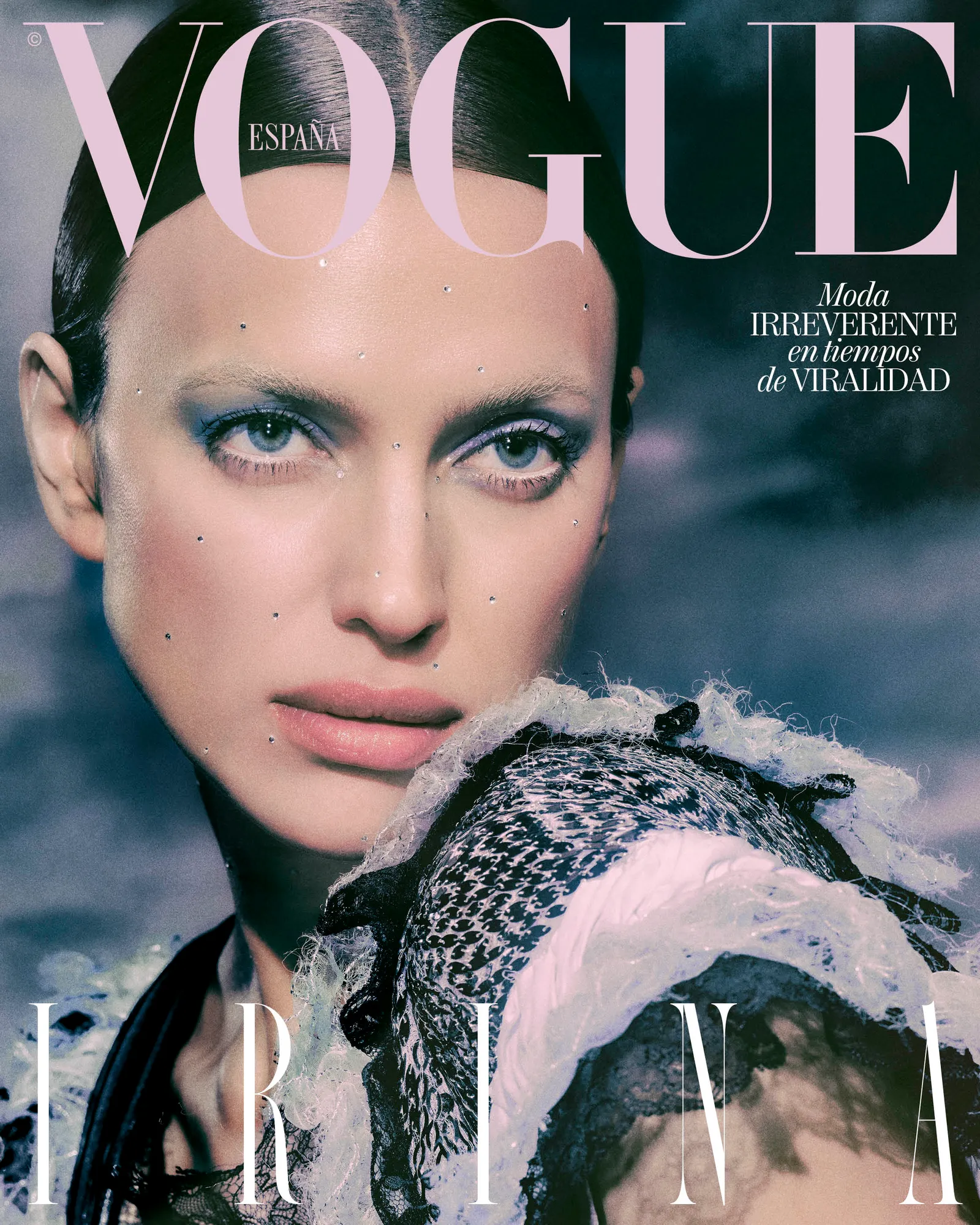 В фотосессии для испанской версии журнала Vogue волосы супермодели собраны в гладкий пучок, а макияж фантазийный: с осветленными бровями и стразами. Снимала Ирину Шейк российский фотогра Елизавета Породина.