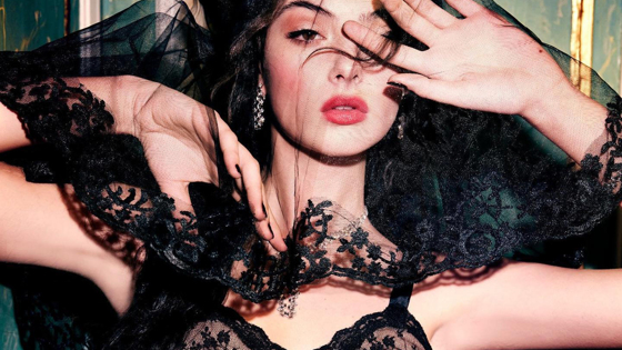 На размещенном фото 18-летняя манекенщица позирует в полупрозрачном бюстгальтере, оформленном черными кружевами. Ее образ дополняют длинные серебряные серьги и фата в тон нижнему белью. В свою очередь, визажисты сделали знаменитости макияж в розовых тонах, сделав акценты на губах, скулах и глазах.