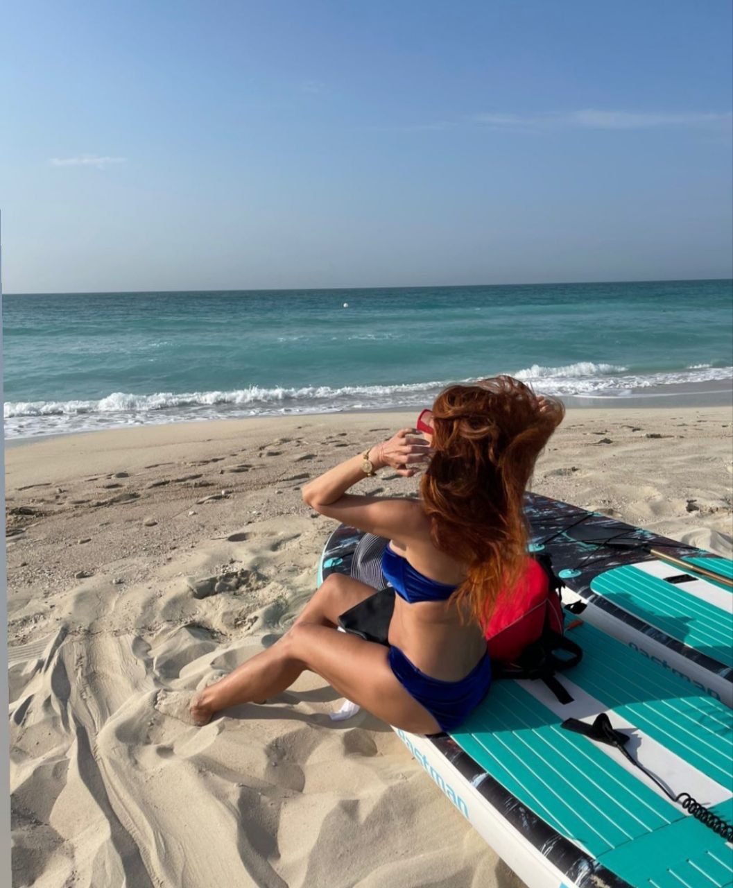 53-летняя Бледанс в раздельном бархатном купальнике синего цвета позировала на пляже пятизвездочного отеля в Абу-Даби. Сев на сапборд спиной к камере, актриса застыла, поправляя огненно-рыжие волосы.