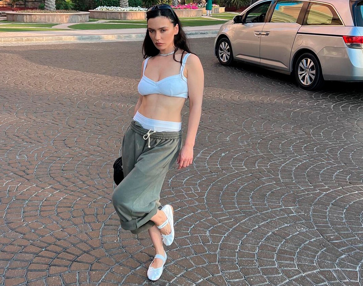 Серябкина отправилась гулять по Дубаю в топе-бра и спортивных штанах, которые открывали полоску шортов. Образ дополнили солнечные очки и серебристая цепь.
