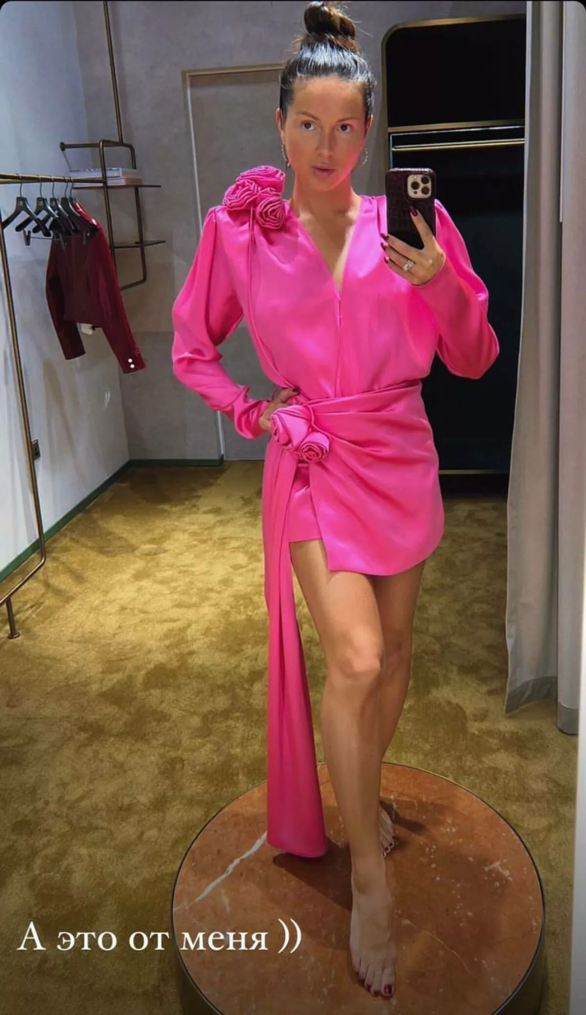 Звезда выложила кадр из примерочной, где она стоит напротив зеркала в платье цвета фуксии. Его украшают тканевые розы. Образ Нюша дополнила серьгами-кольцами.