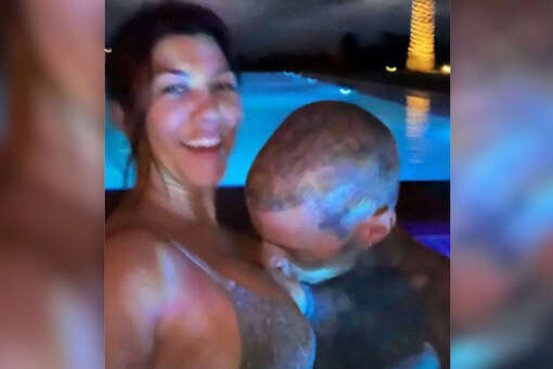Трэвис Баркер уже несколько недель путешествует по миру в рамках музыкального тура. Он сильно скучает по супруге и решил опубликовать совместную фотографию. На ней Кортни Кардашьян позировала в серебряном бикини в обнимку с мужем в бассейне. Для кадра Трэвис Баркер поцеловал бизнесвумен в грудь.