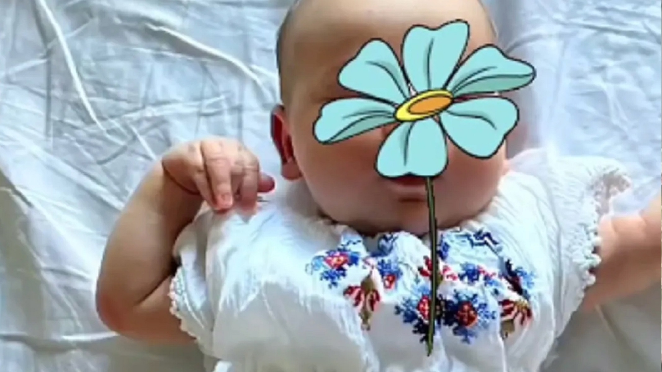 На снимке девочка одета в белое платье с цветочным рисунком. Она потягивается, лежа на простыне. Пока бабушка решила не показывать лицо внучки и закрыла его стикером.