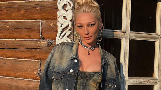 Инфлюэнсера запечатлели в джинсовом мини-платье с частично обнажавшим ее грудь декольте в сочетании с оверсайз-курткой из того же материала. В качестве обуви она выбрала черные сапоги-казаки, а из аксессуаров на ней были серьги-кольца, массивные цепи и каффы.