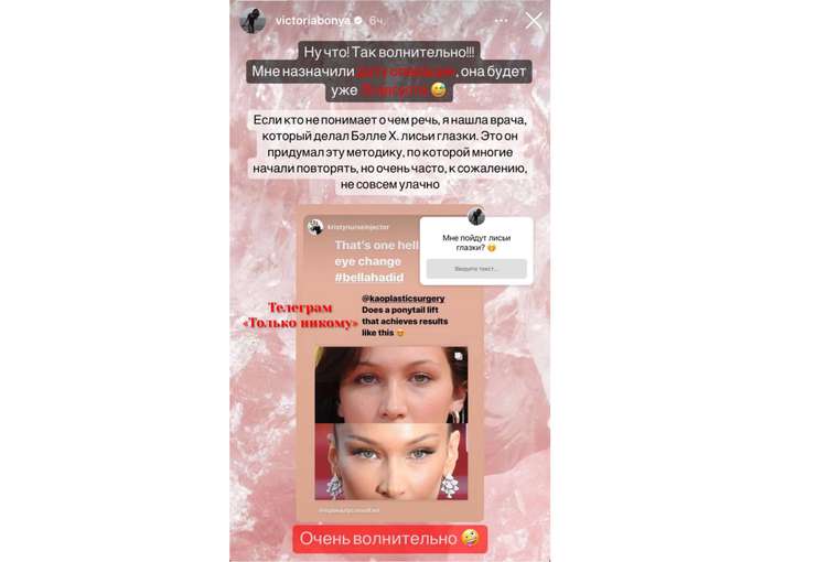 Хотя Виктория Боня активно продает собственные курсы по фейс-фитнесу, однако не скрывает, что прибегает к услугам пластических хирургов. Не так давно она «подтянула» овал лица, а теперь решила сделать «лисьи глазки» как у Беллы Хадид. Для этого она нашла того самого пластического хирурга, который делал операцию самой Хадид и согласился прооперировать и нашу Вику.