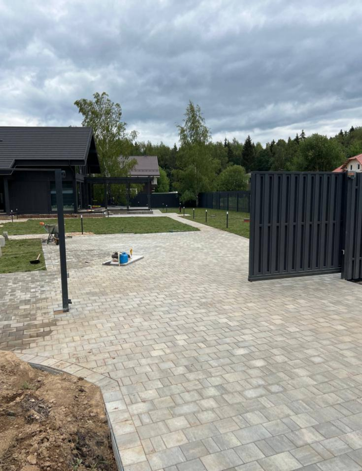 На фотографии попали дорожки из каменных плит и гравия, ухоженный газон, посаженные деревья и светильники.