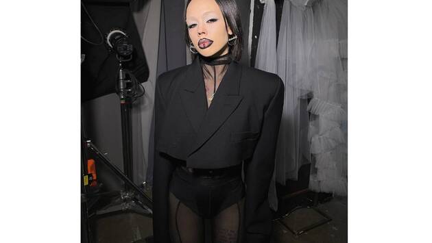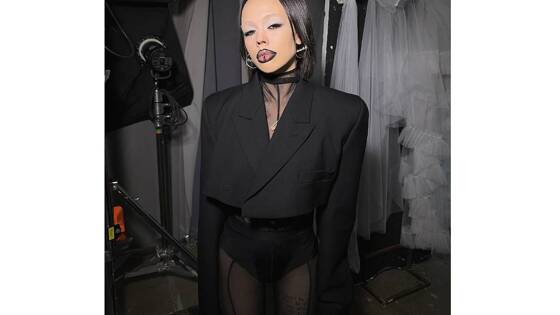 На размещенных кадрах 23-летняя исполнительница предстала в монохромном черном образе, сидя на стуле и положив ногу на ногу. Для фотосессии она надела укороченный жакет и прозрачные лосины с остроносыми ботильонами на шпильках. При этом звезда окрасила волосы в черный цвет и сделала контрастный макияж, высветлив брови и подчеркнув глаза и губы черным карандашом.