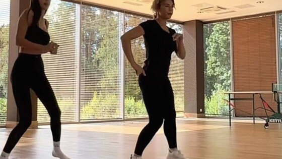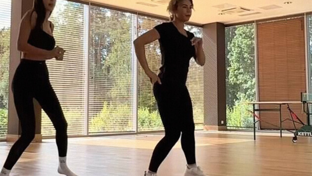 Перед камерой Оксана Самойлова повторила за преподавателем несколько движений. Модель позировала в черных легинсах и топе. Она также отметила, что это ее первое занятие в жизни, и пока она не чувствует себя уверенно в танцевальном зале.