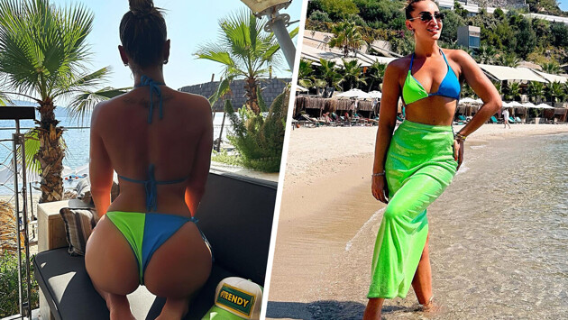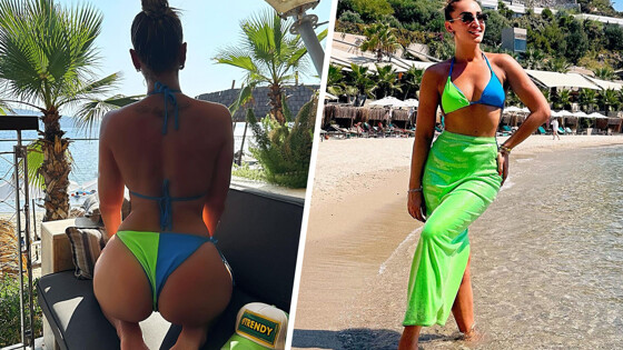 37-летняя Ольга Бузова позировала на берегу моря в сине-зеленом купальнике, состоящем из треугольного лифа и трусов на завязках. Певица собрала волосы в небрежный пучок и дополнила образ солнцезащитными очками в золотистой оправе.
