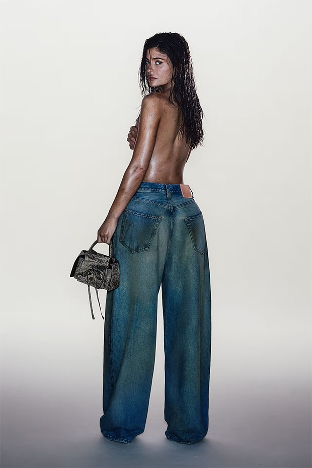 На размещенных кадрах 26-летняя знаменитость позировала топлес, примерив джинсы с широкими удлиненными штанинами. Одной рукой манекенщица прикрыла обнаженную грудь, а в другой держала миниатюрную серую сумку.
