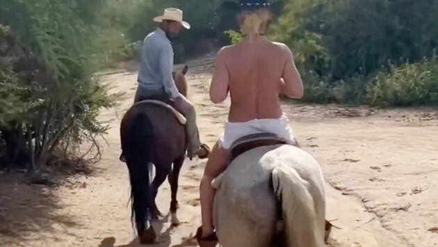 На видео 41-летняя Бритни Спирс запечатлена топлес верхом на лошади. На певице были надеты короткие белые шорты и ковбойская шляпа.