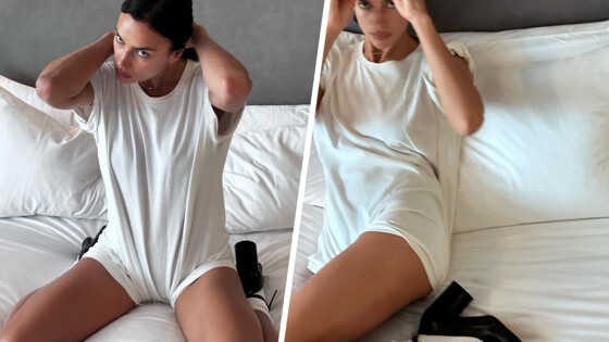 Перед камерой модель позировала в одной белой футболке на кровати.