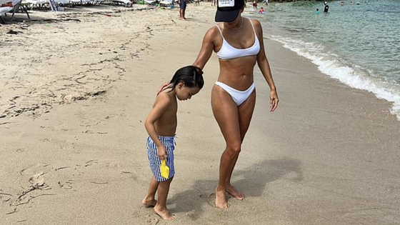 48-летняя звезда телесериала «Отчаянные домохозяйки» предстала на фоне пляжа и моря, держась за руку с сыном. При этом она надела белый раздельный купальник и продемонстрировала тело с кубиками пресса. Кроме того, на размещенном снимке видно, что в области бедер звезды присутствует целлюлит.